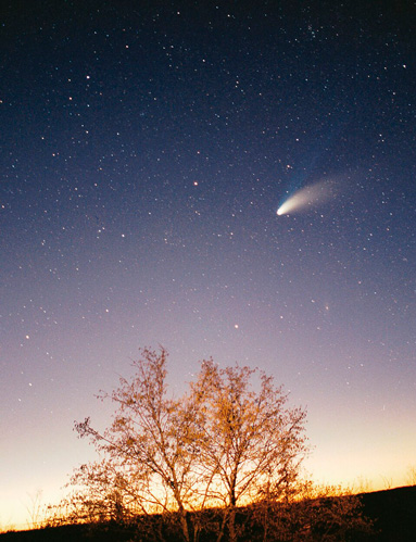 Комета Хейла-Боппа и галактика Андромеда над подсвеченным деревом (1997)